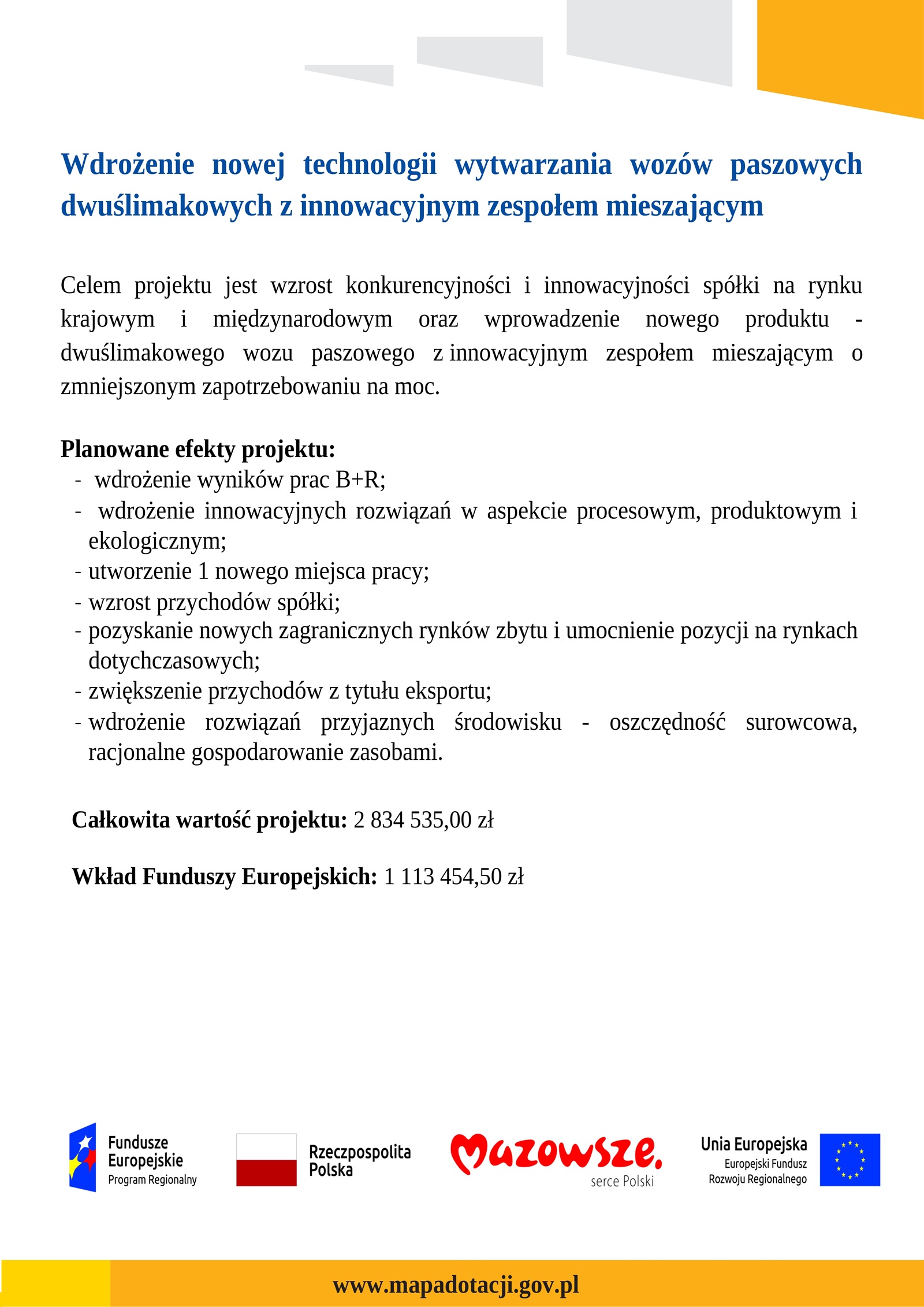 Realizacja Projektu, zakup usługi badawczo-rozwojowej, w ramach której zostanie opracowany: nowy wyrób – innowacyjny zespół mieszający w wozie paszowym oraz nowa technologia jego wytwarzania wpłynie bezpośrednio na wzrost konkurencyjności przedsiębiorstwa.