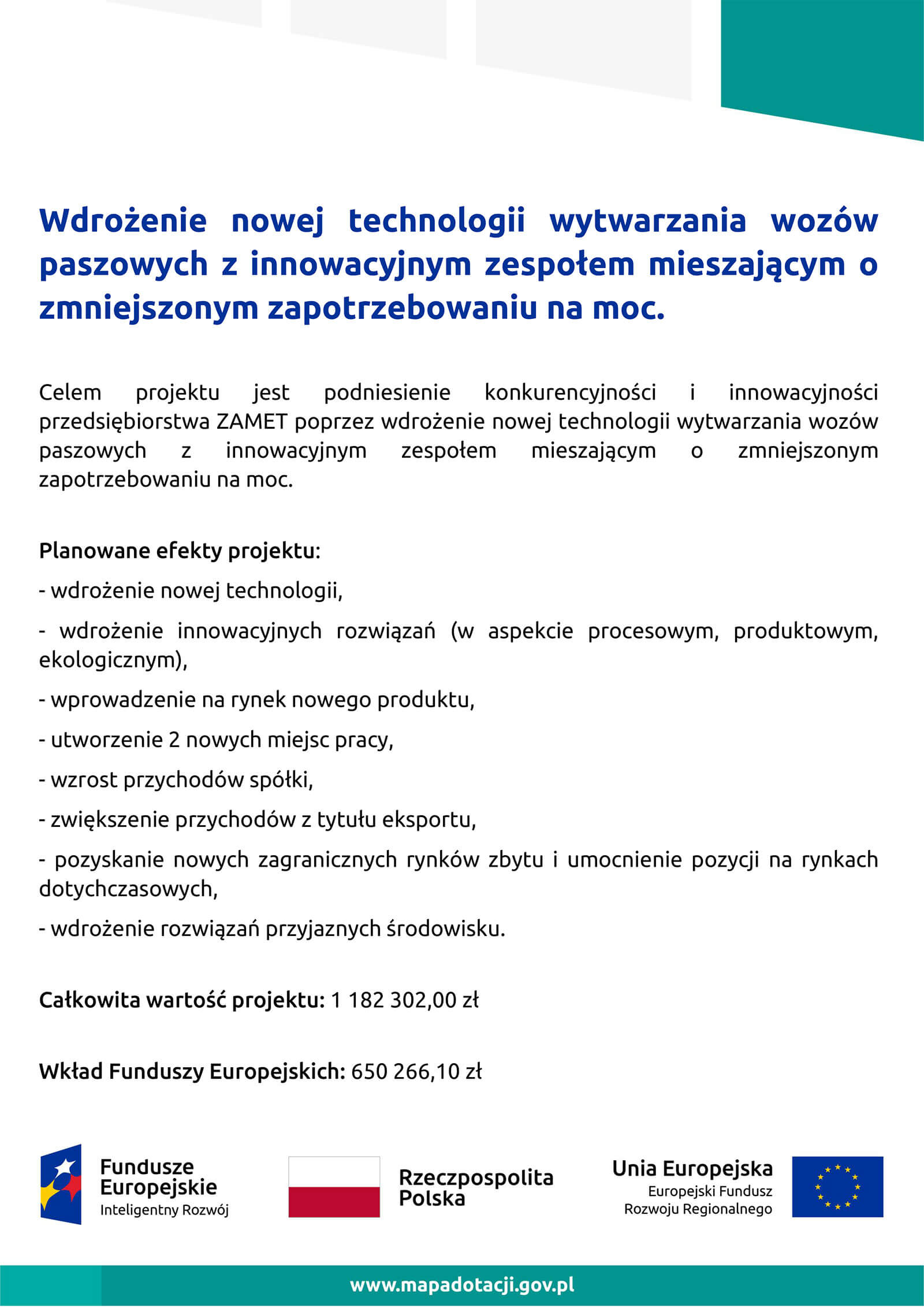 Celem projektu jest podniesienie konkurencyjności i innowacyjności przedsiębiorstwa „ZAMET” Zabielski Sp. j.